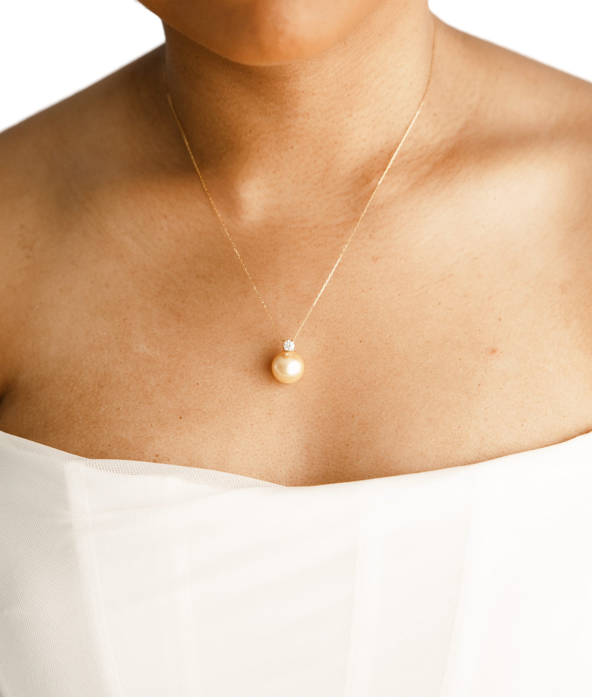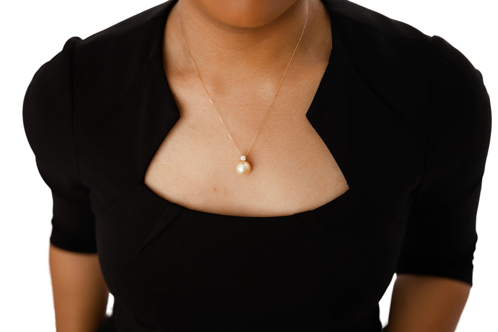 Inspired by the perfect marriage of high-end 18-carat gold, conflict-free diamonds and with a touch of sustainably sourced South Sea pearls, we create the exquisite elegance of the Elsa South Sea Champagne Pearl with Solitaire Diamond Necklace. Admire the exceptional 12-13mm size and the romantic golden hue. The 0.25ctw round solitaire diamond adds a touch of sophistication, making this necklace a timeless statement piece that nods respect for professional women in boardrooms to your evening little black dress. This South Sea Pearl Pendant is a symbol of your success and a reflection of your impeccable taste. Its understated elegance truly speaks volumes.