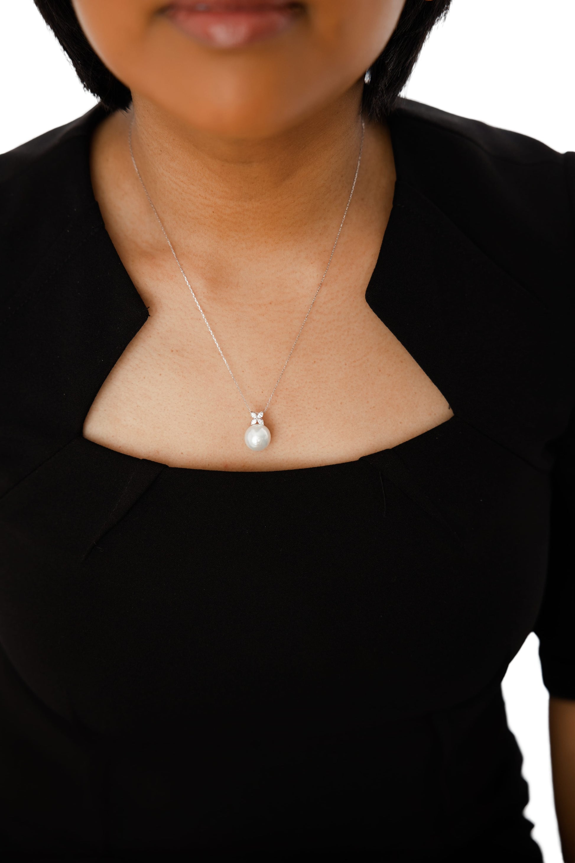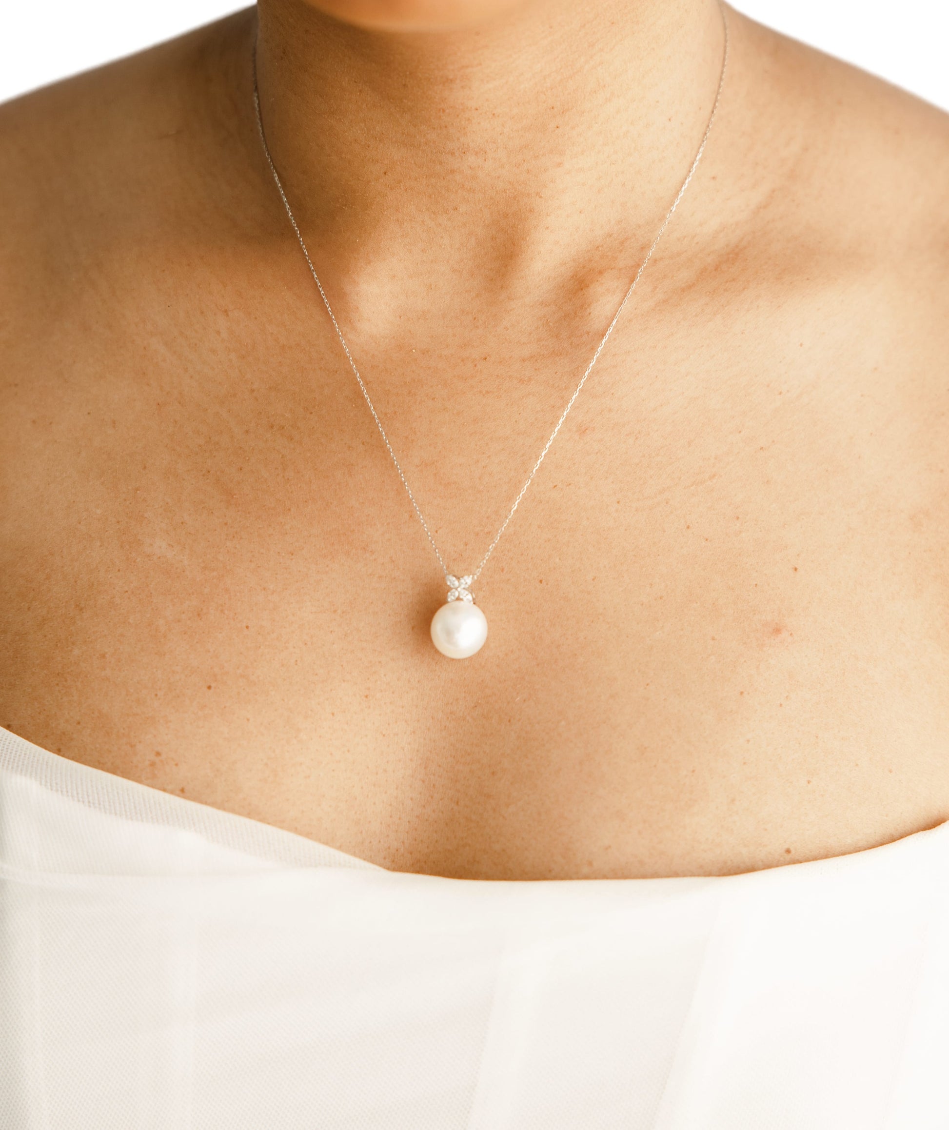 Complement the look of our Clover Flower Diamond South Sea Pearl Stud Earrings with this matching Clover Flower Diamond South Sea Pearl Necklace. Crafted in 18K white gold, this necklace features a stunning 11mm South Sea white pearl and 4 sparkling marquise lab-grown diamonds totaling 0.25 carat. Looking for a necklace that's so versatile to wear at a wedding, boardroom to date night? How about this timeless and classic jewelry that can be worn as both statement jewelry and everyday luxury and one that can be passed on as an heirloom jewelry. This South Sea pearl necklace provides the same quality as the best 18K gold jewelry brands, without having to bear the guilt on your wallet.